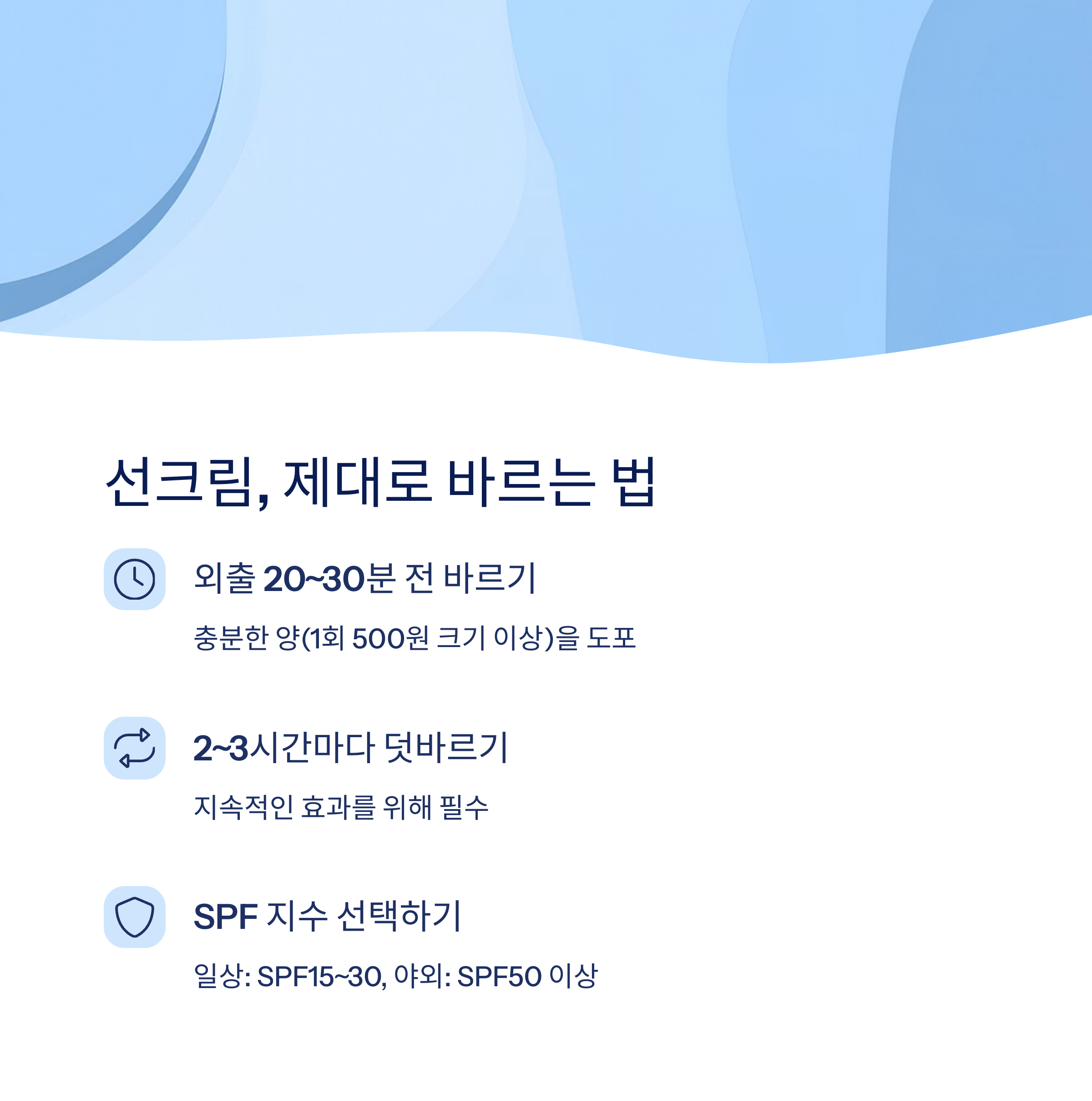 올바른 사용법은 외출 20~30분 전, 충분한 양(1회 500원 크기 이상)을 꼼꼼히 도포하는 것입니다.