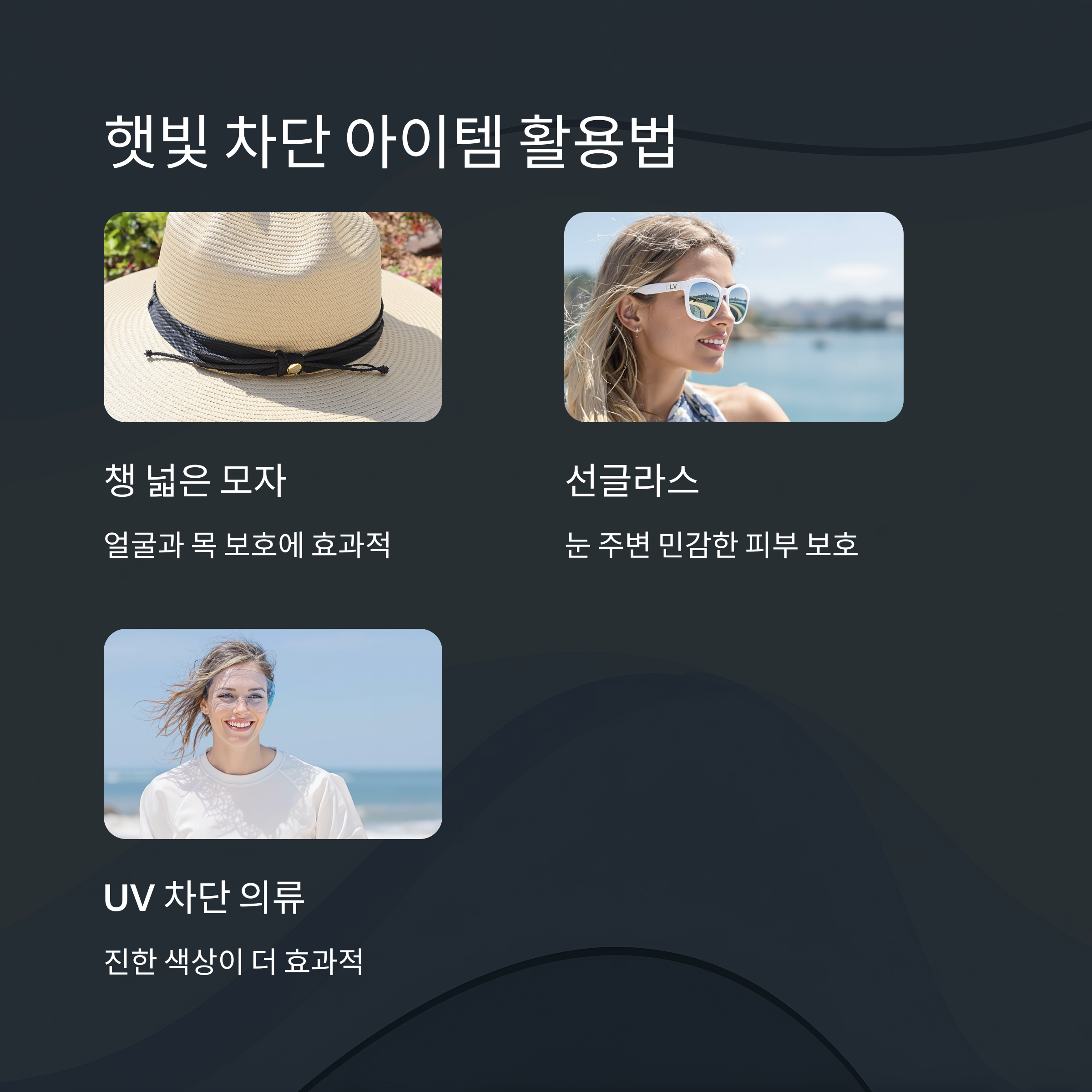 외출 시에는 챙이 넓은 모자, 선글라스, UV 차단 마스크, 얇은 긴팔 옷 등을 적극 활용하세요.