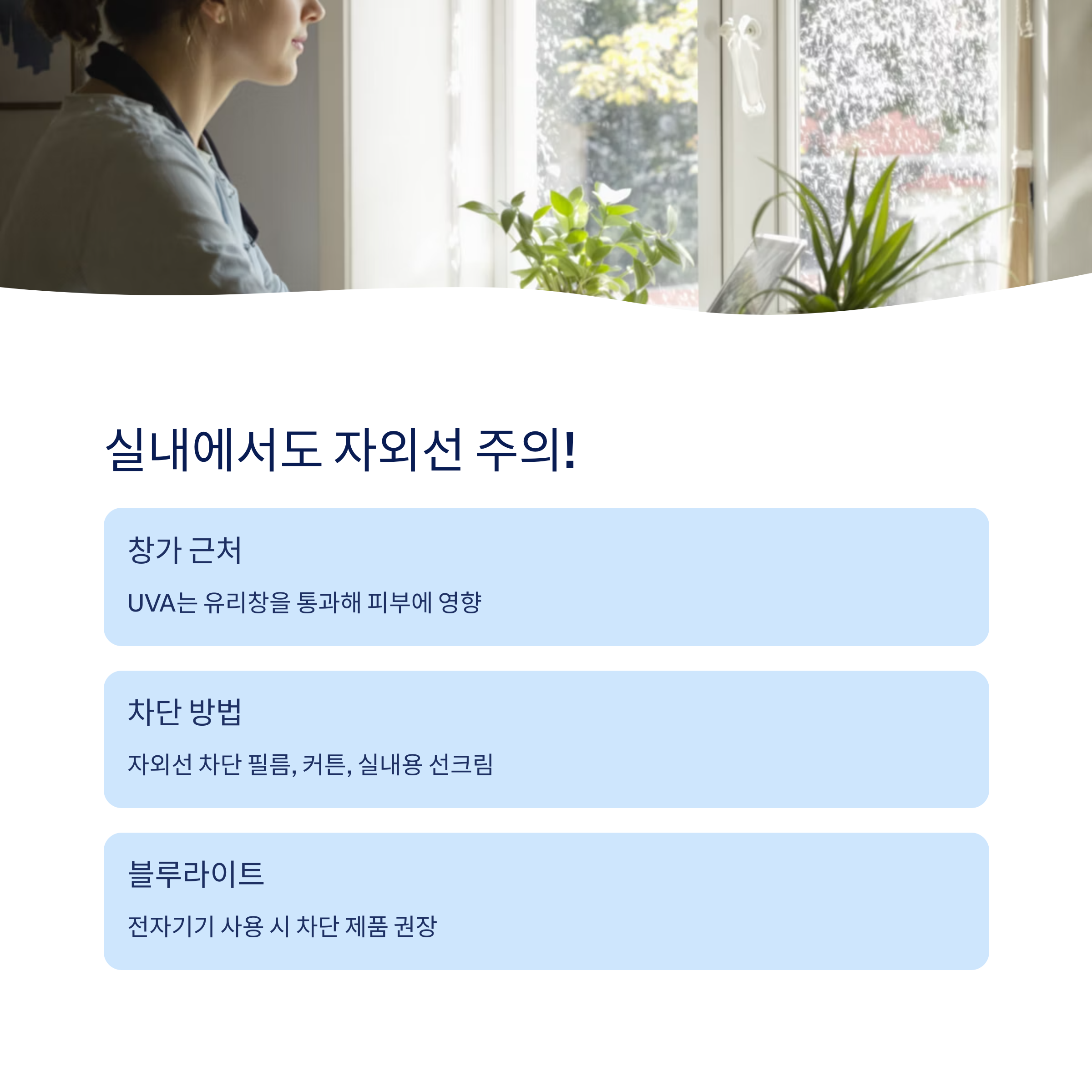 특히 창문 근처에서 근무하거나 공부하는 경우, 자외선 차단 필름이나 커튼, 실내용 선크림 사용이 필요합니다.