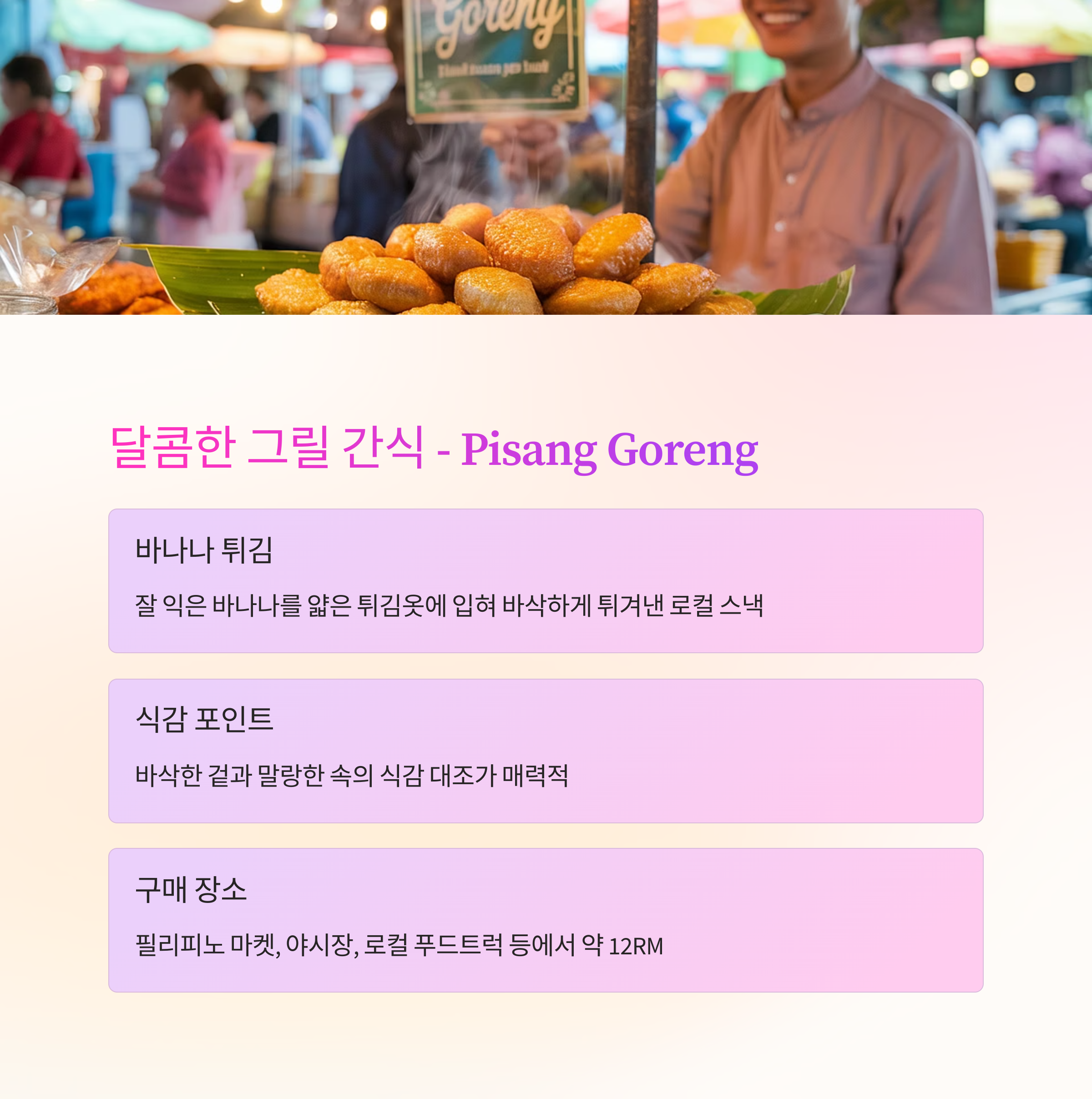 잘 익은 바나나를 얇은 튀김옷에 입혀 바삭하게 튀겨낸 로컬 스낵입니다.