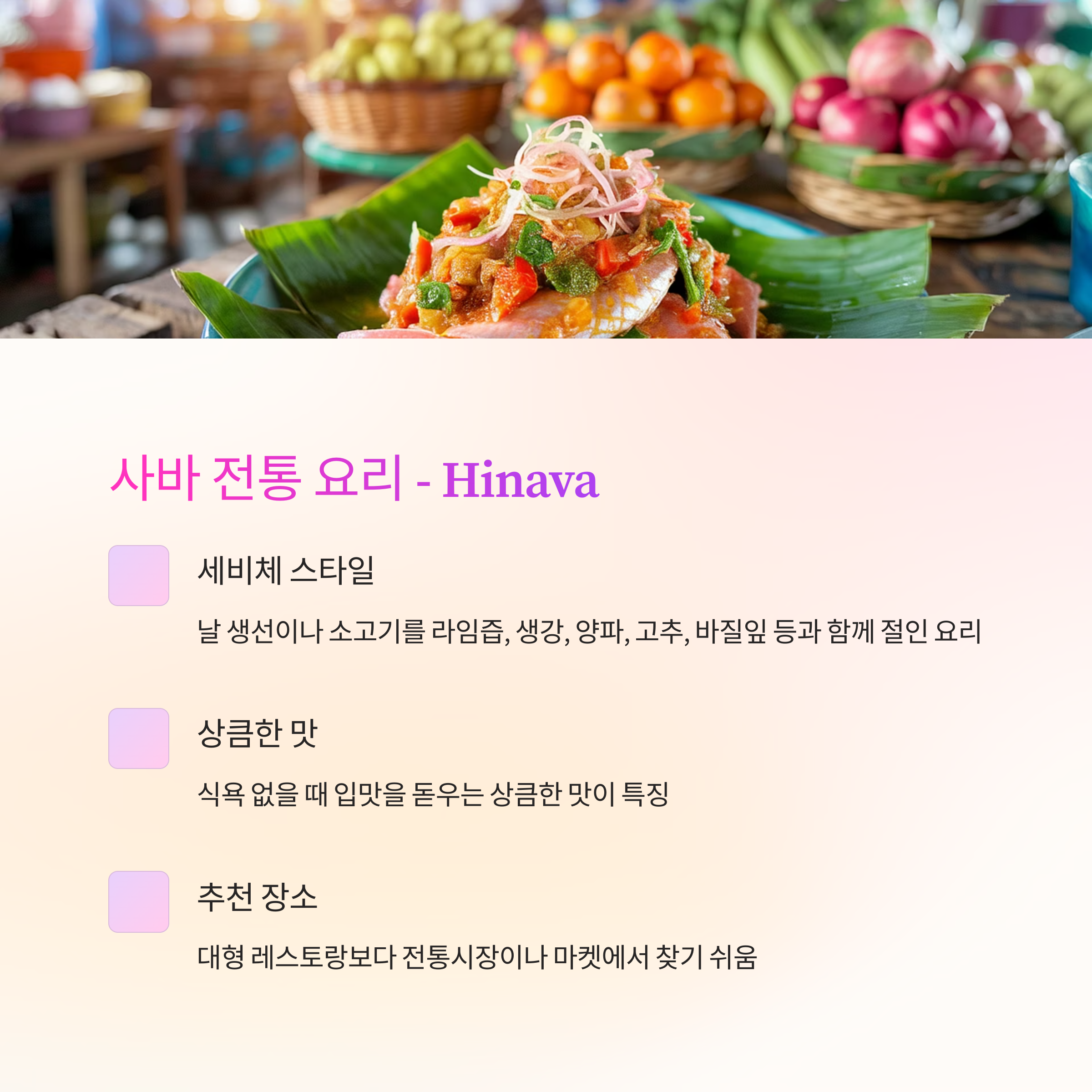- 마치 세비체(Ceviche)를 연상시키는 상큼한 맛