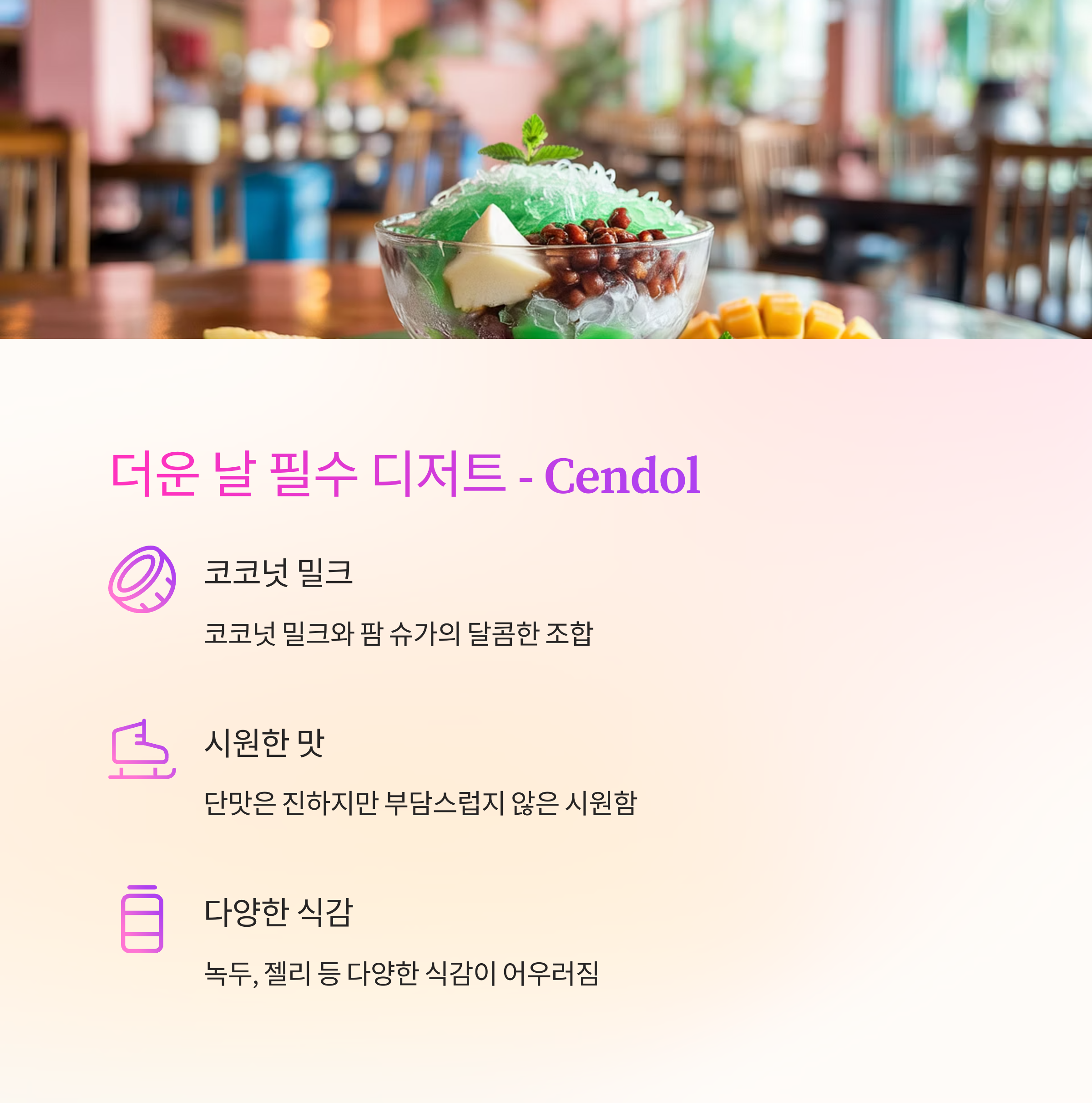 더운 날 필수! Cendol은 코코넛 밀크와 팜 슈가,