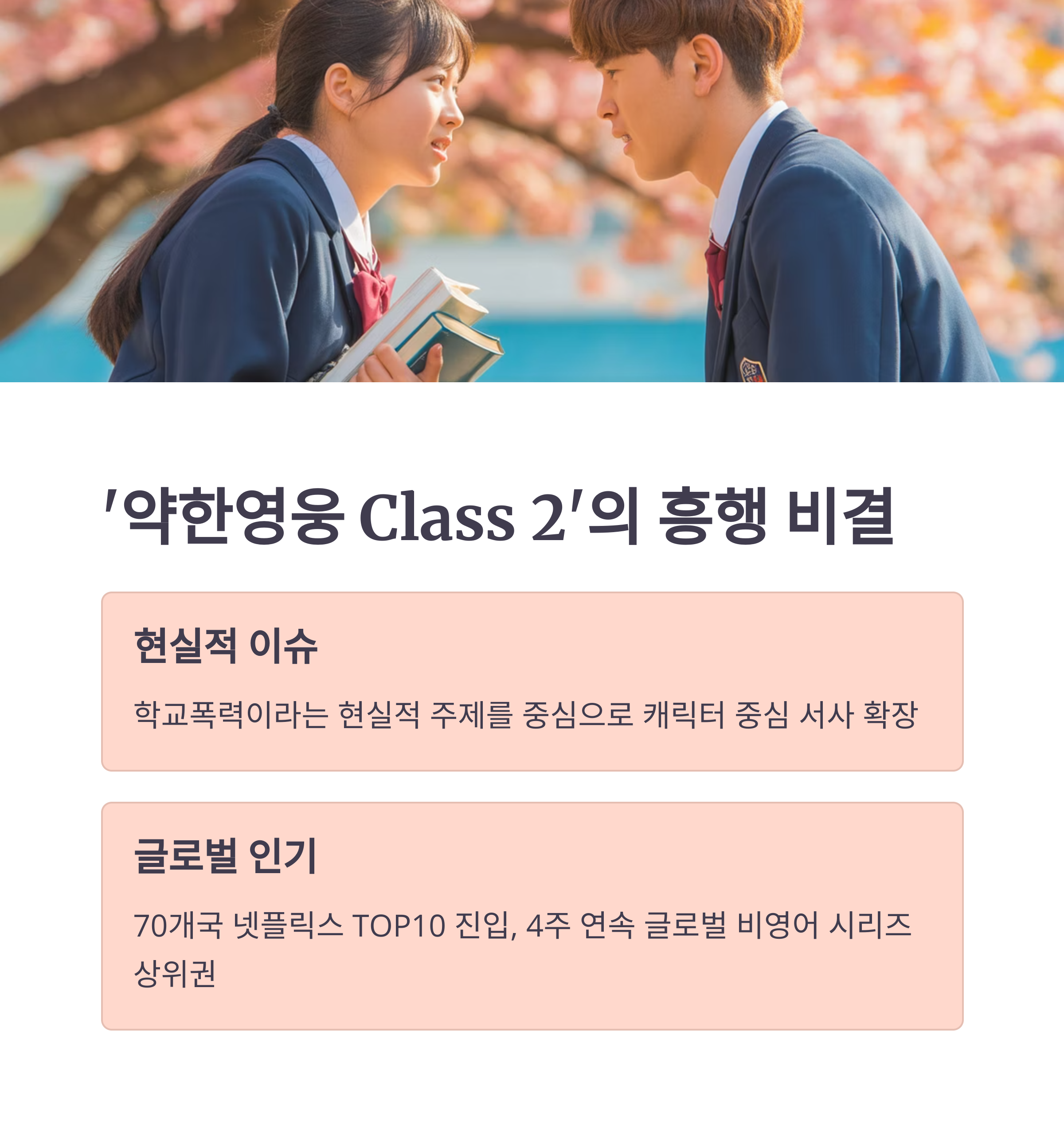 특히 '약한 영웅 Class 2'는 시즌 1에 이어 시즌 2에서도 글로벌 흥행을 기록하며 플랫폼을 대표하는 시리즈로 자리매김했습니다.