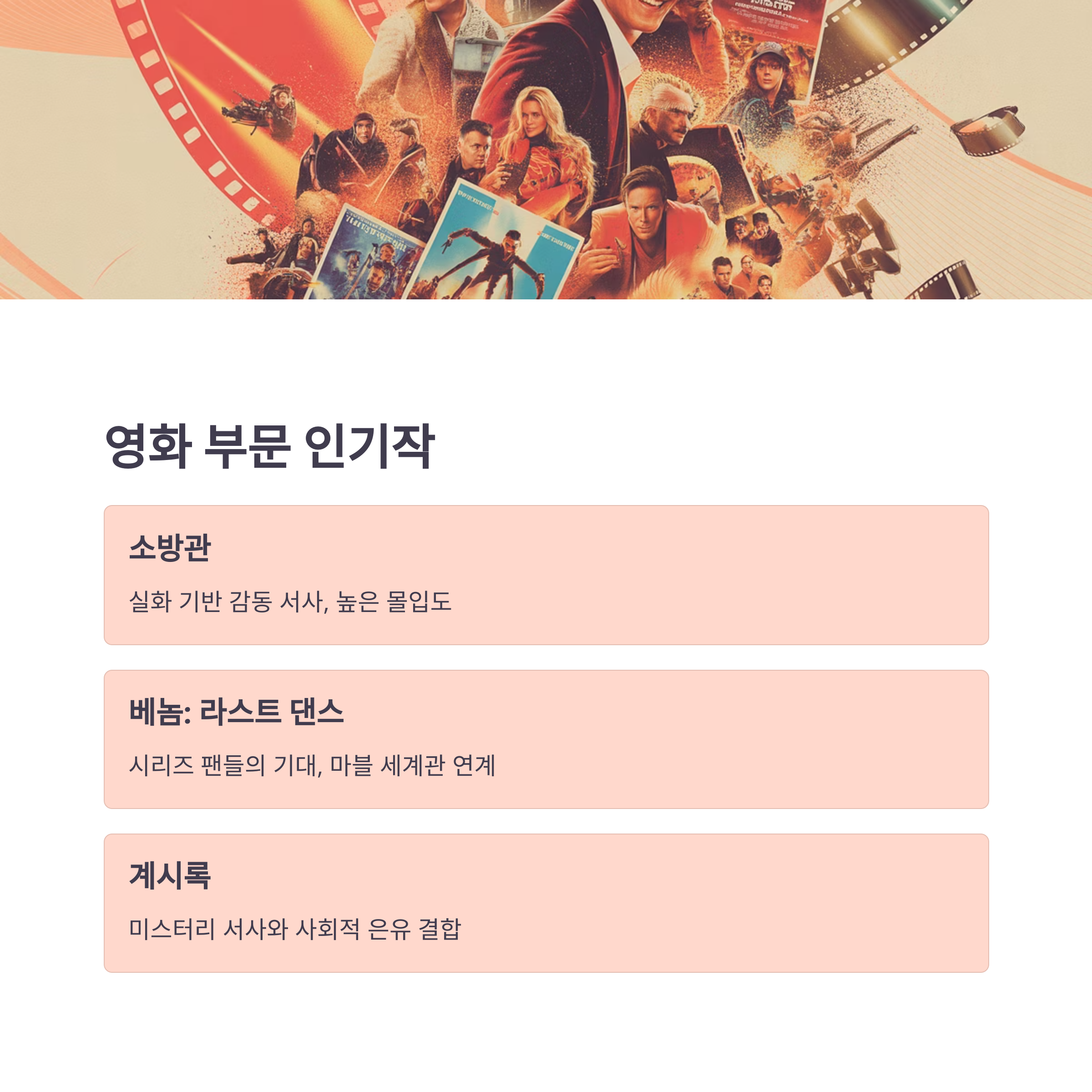 | 영화 | 소방관, 베놈, 계시록 등 | 실화 감동, 액션, 사회적 메시지 결합 |